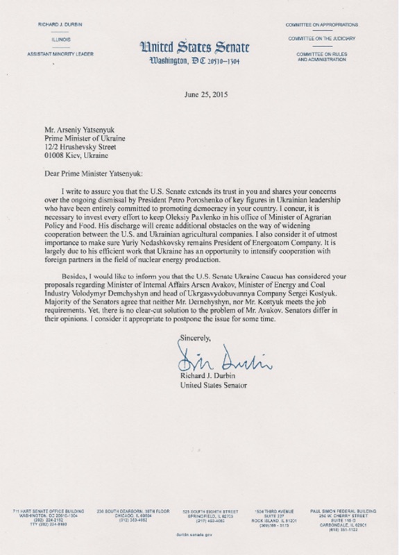 Опубликованное письмо сенатора Дурбина Яценюку датировано 25 июня 2015 года.